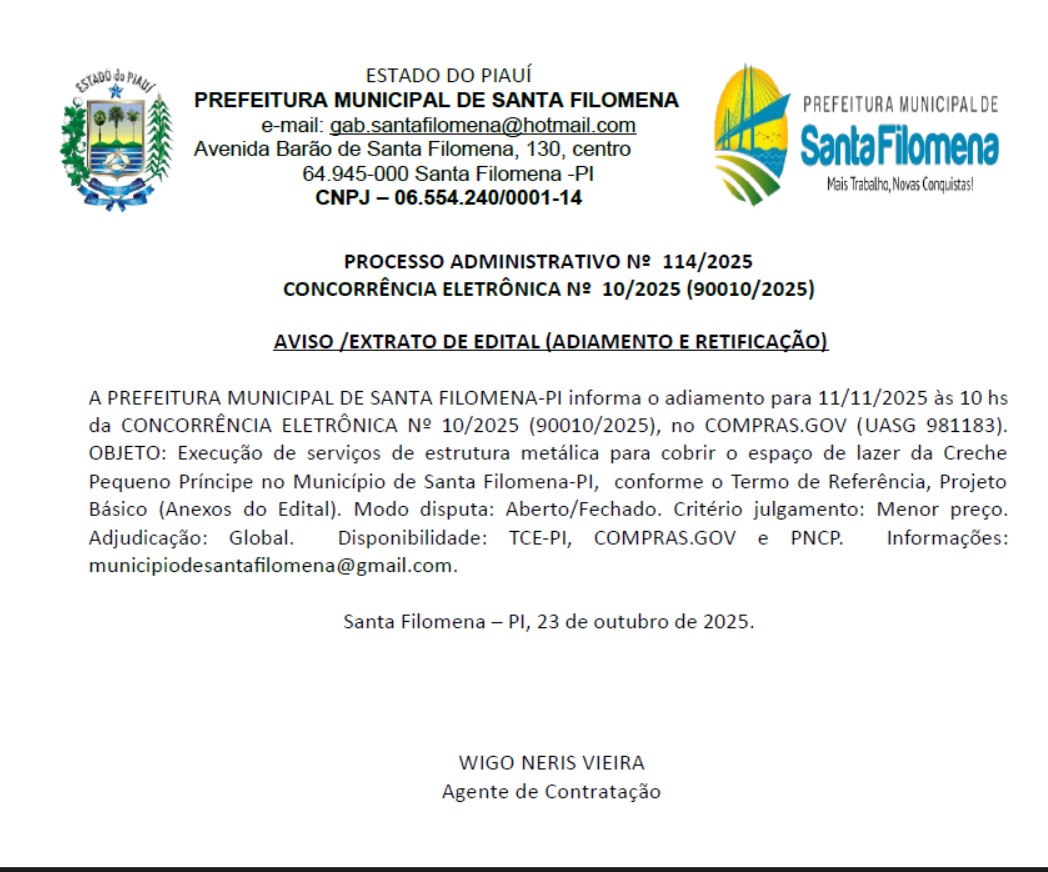 ADIAMENTO E RETIFICAÇÃO DE CONCORRÊNCIA ELETRÔNICA 010/2025